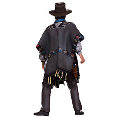 With his right hand next to his body, ready as if he is about to pull a gun for a duel, the young adventurer from the year of 1985 presents himself with his body covered by a rustic brown poncho with tribal adornments on his cowboy clothes, a blue handkerchief on his neck and a typical hat on his head.