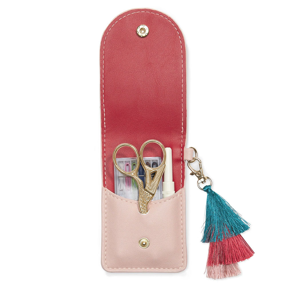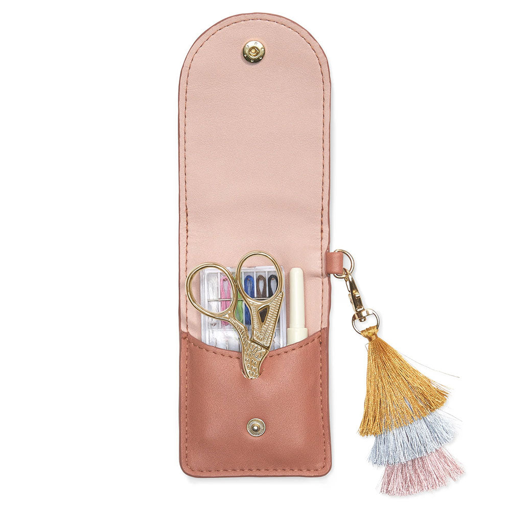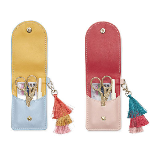 A smart and compact travel sewing kit in vegan leather case, perfectly sized to take with you anywhere. A practical gift for frequent travelers, stocking stuffers, birthdays, or just to tuck into your work desk, or have on hand at home for wardrobe mishaps. When you are all out of sewing material and you're all out of stitches, check out this fancy, yet practical sewing kit. It's the best stitch-uation you could be in when things fall apart!