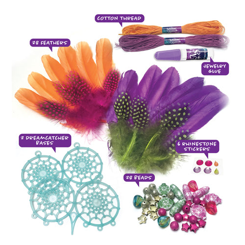 Kit includes 2 glow in the dark dreamcatcher bases, 2 colors of cotton thread, 28 feathers, 28 beads, 6 rhinestone stickers and jewelry glue