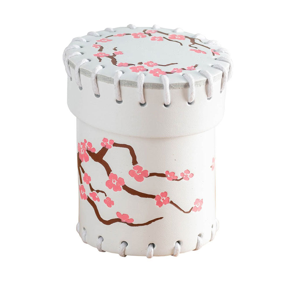 Denne oplevelse har inspireret os til at skabe denne japanske læder terningskop. Vi lavede det af naturligt læder i hvid farve og prydede dets låg og krop med et farverigt tryk; Det viser en brun kirsebærtrægren, da den begynder at komme til at komme til live med lyserøde blomster!