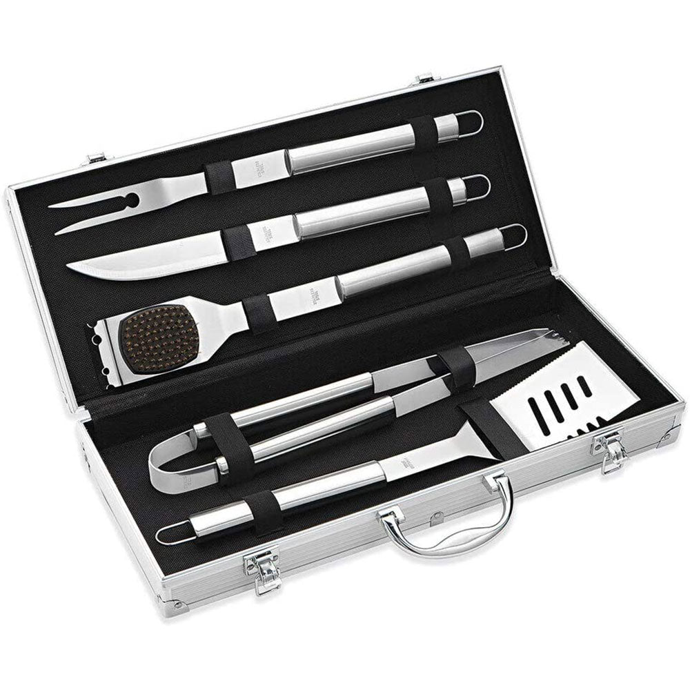 Das Avanti BBQ Starter Tool Set verfügt über eine Metallkonstruktion, die maximale Haltbarkeit und Benutzerfreundlichkeit gewährleistet. Integrierte Haken ermöglichen das Aufhängen jedes Werkzeugs bei Bedarf. Die Aluminium-Tragetasche hält Ihre Werkzeuge sicher zusammen, sodass Sie sie auch unterwegs mitnehmen können. Das Set beinhaltet 1 x Wender, 1 x Zange, 1 x Gabel, 1 x Messer, 1 x Kupferbürste, 1 x Aufbewahrungskoffer.