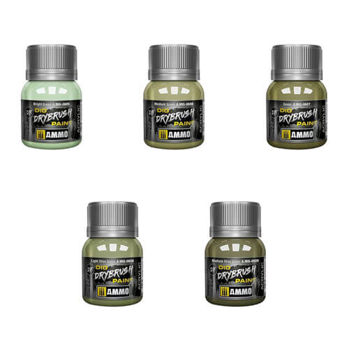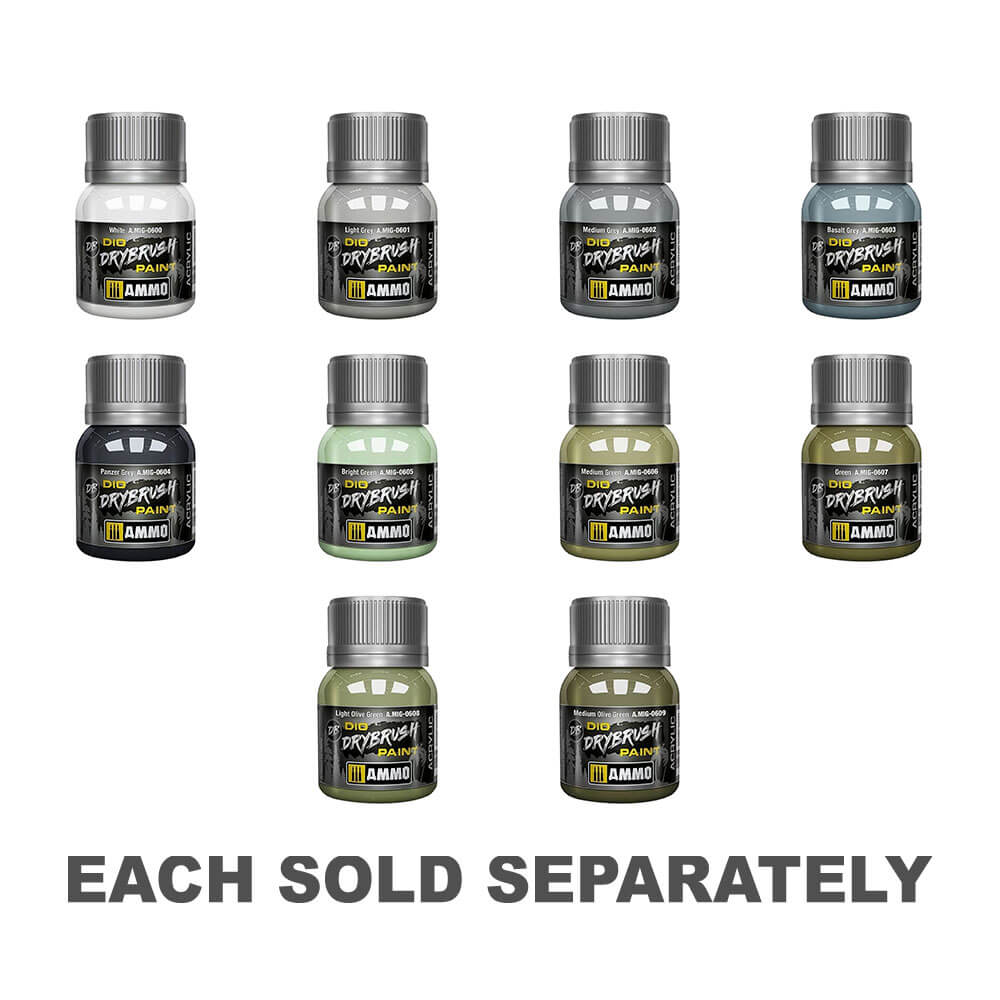 - La línea de color Dio DryBrush consiste en una gama de tonos más claros para impartir un aspecto desgastado en sus modelos, así como tonos más oscuros, incluidos tonos metálicos, de óxido y astillado para crear una gama de efectos dinámicos
