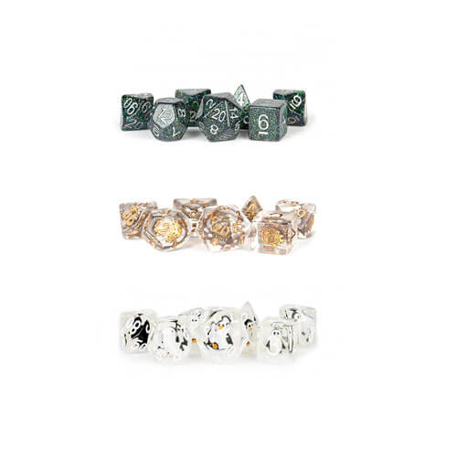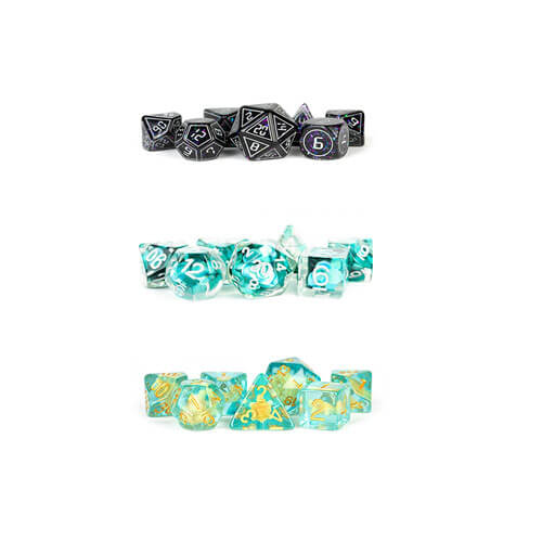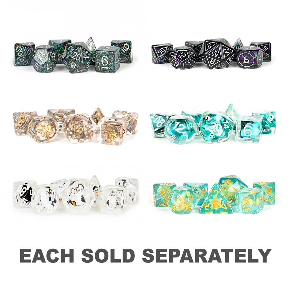 Los dados de resina de MDG tienen inclusiones únicas que agregan destellos a cualquier mesa de juego. Estos son conjuntos de dados poliédricos de 16 mm de tamaño completo que vienen con 7 dados (D4, D6, D8, D10, D10%(00-90), D12 y D20).