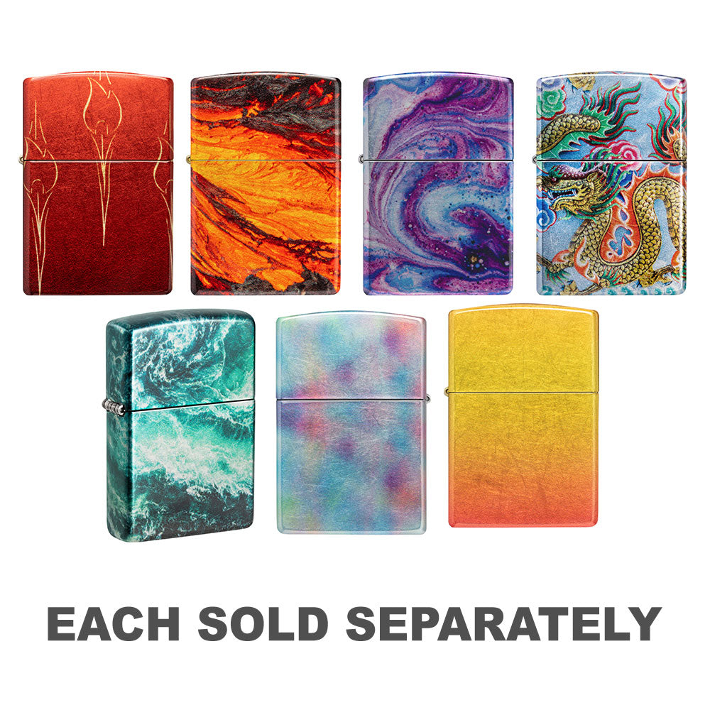 Le briquet de conception de fusion de Zippo Dragon 540 est fabriqué à partir de toutes les constructions en métal, la conception à vent fonctionne pratiquement n'importe où. Une évolution totalement nouvelle de deux de nos méthodes d'empreinte les plus recherchées. Éléments métalliques chatoyants et palettes de couleurs translucides élégantes, la marque de marque du processus de fusion se joigne à la technologie de couleur propriétaire 540 pour envelopper le briquet de tous les côtés pour un résultat final transparent, irisé et absolument étonnant. Ce design de dragon vif tourbillonne au sommet d'une toile de fond géométrique rouge et est complété par le logo le long d'un côté.