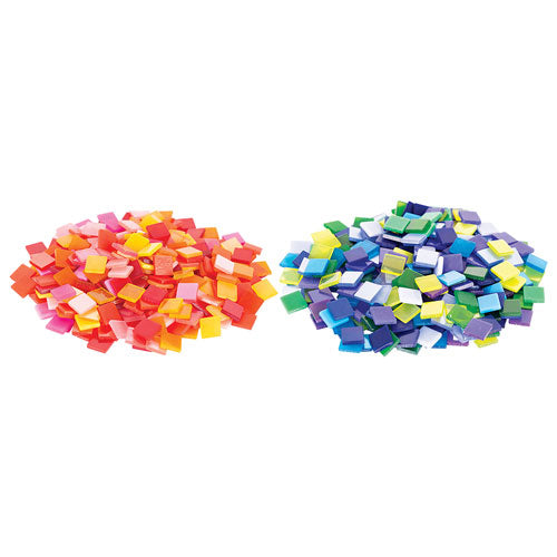 - This pack of Deco Mosaic Tiles includes a mix of warm colours (yellows, oranges, pinks, crimson and reds), in four surface finishes (opaque, frost, clear and glossy) which create glass-like effects.
