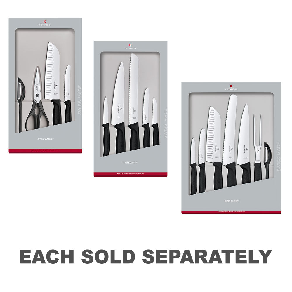 Le jeu noir de cuisine classique Victorinox Classic contient un ciseau de cuisine universel, un éplucheur universel, un couteau d'orage et un couteau de cuisine. Ce sont les éléments essentiels pour toutes vos tâches culinaires quotidiennes. Avec des poignées ergonomiques et des arêtes super tranchantes, sûr que la cuisine ne vous coûtera rien.