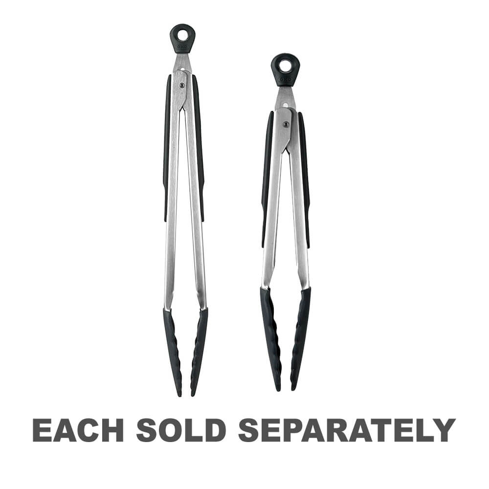 Le nostre pinze classiche ora offrono teste di silicone che proteggono le finiture antiaderenti. Le teste sono silicone resistente al calore e funzionano bene per raschiare le padelle senza graffi. Come tutte le pinze Oxo, si blocca per un comodo stoccaggio e hanno la giusta quantità di tensione per il comfort.