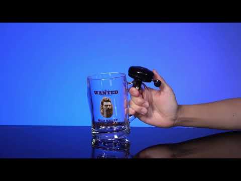 Tazza di birra di vetro con una campana nera attaccata al manico - suonalo quando è il momento di un'altra bevanda! Presenta l'icona australiana Ned Kelly Wanted Poster. Perfetto per mantenere il tuo bicchiere pieno in ogni momento!