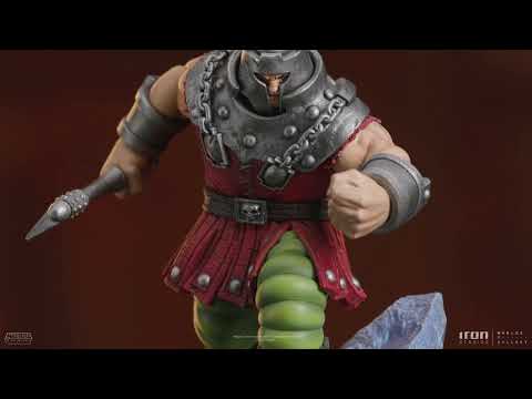 プラネットエターニアの平野の岩の間の重い階段で、彼の戦いのxを振るう小さな頑丈な戦士が、彼の強力な足をコイルとして使用して、文字通り彼の敵に頭を突き刺す準備ができています。彼の素朴なフラットトップメタルヘルメットを使用して、彼の上半身を覆い、赤いチュニックの上に彼の胸に鎖で取り付けられている巨大な鎧を使用して、この大胆不敵な英雄的な戦士は像に掲載されています「ラムマンBDS-宇宙のマスター - アート - Iron Studiosによる1/10 "。