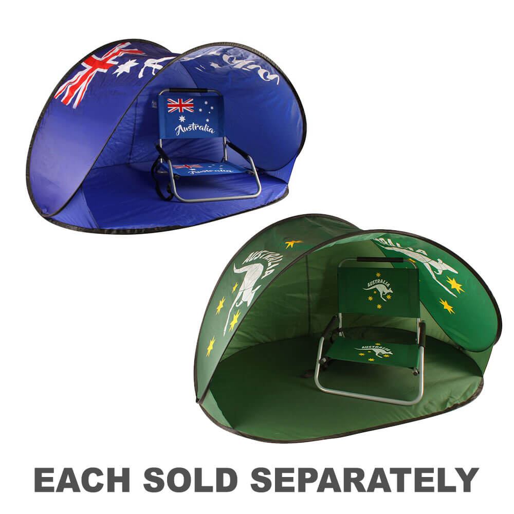 この折りたたみやすい太陽の下で明るい太陽の下で自分自身を快適にさせすぎないようにしてください。緑と金の旗をテーマにしたデザインで、これはオーストラリアの日を祝い、ビーチでそれを誇示するのに最適です!