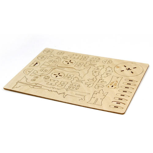 - Punch Out: bevat één lasergesneden, FSC -gecertificeerde houten vel met gemakkelijk verwijderbare stukken.