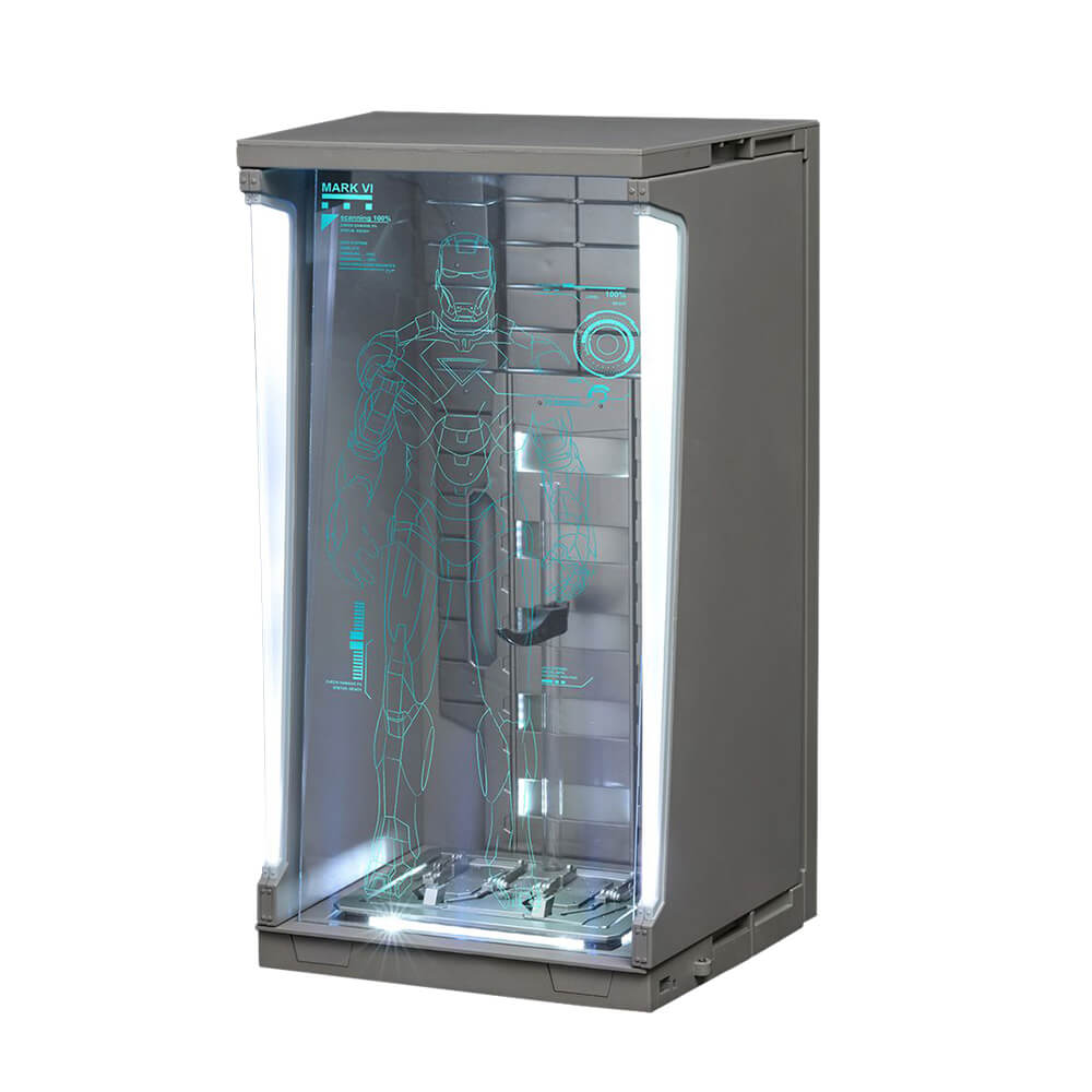 De Hall of Armour 1/6 schaal Diorama Accessoire -eenheden zijn meesterlijk vervaardigd en authentiek gedetailleerd om de Hall of Armour van Iron Man 3 te repliceren, stijlvol ontworpen als aanvulling op de hedendaagse architectuur van het herenhuis van Tony Stark. Deze film-nauwkeurige accessoires hebben een realistisch metallisch schilderij en meer dan 20 verschillende LED-verlichtingsgebieden (17 witte LED's en 3 blauwe LED's), evenals transparante acrylplaten met holografisch-achtige effectstickers om een dynamisch display in uw collectie te creëren.