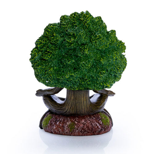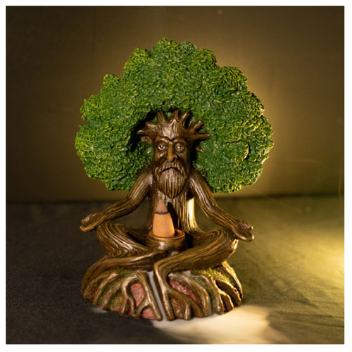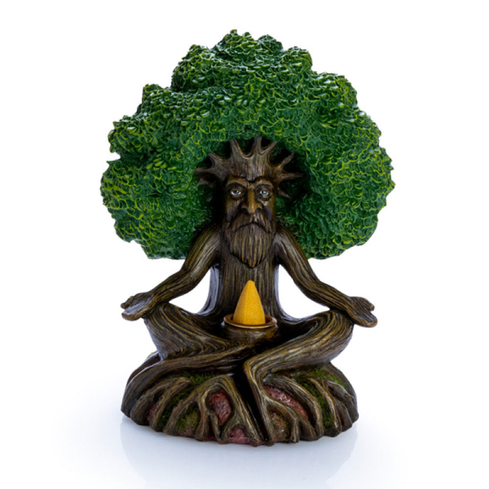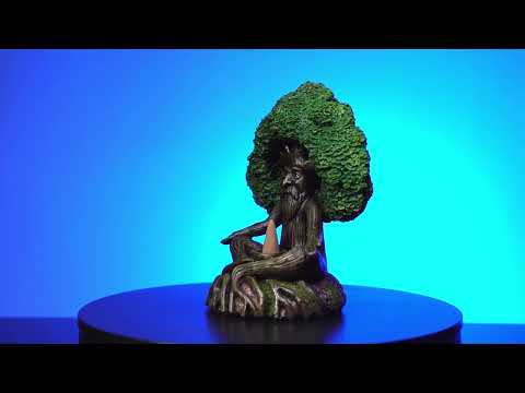 Magisk tilbakestrøkningsbrenner med tilbakestilling med et mediterende eldgamle tre. Plasser en tent røkelseskjegle i treets fang og se røyken strømme ut gjennom røttene. Passer for røkelsekegler.