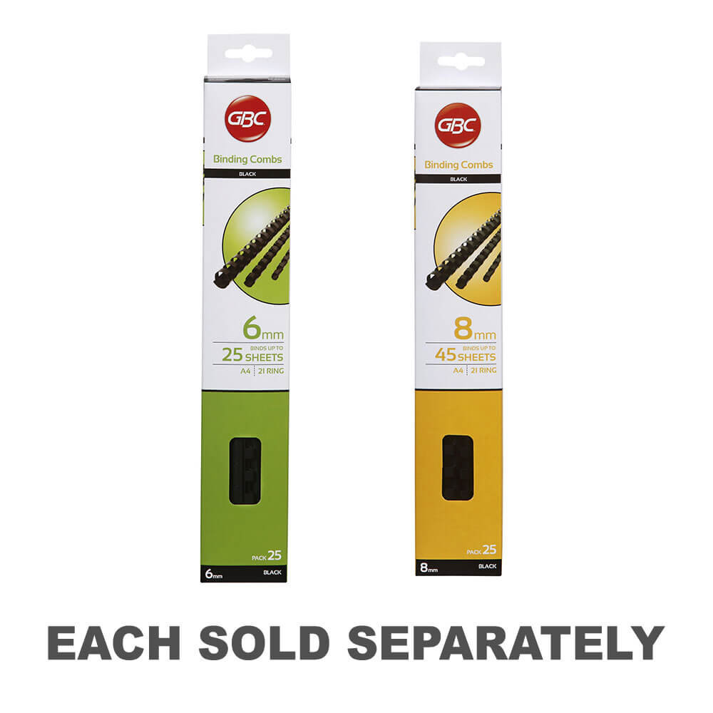 Disse GBC -plastbindingskombene er sterke og holdbare og legger til et flott preg på en rekke dokumenter, inkludert presentasjoner, rapporter og prosjekter for bruk av skole eller hjemmekontor. De 6 mm GBC -plastbindingskamene har 21 løkker som sikkert har opptil 25 ark A4 -papir.