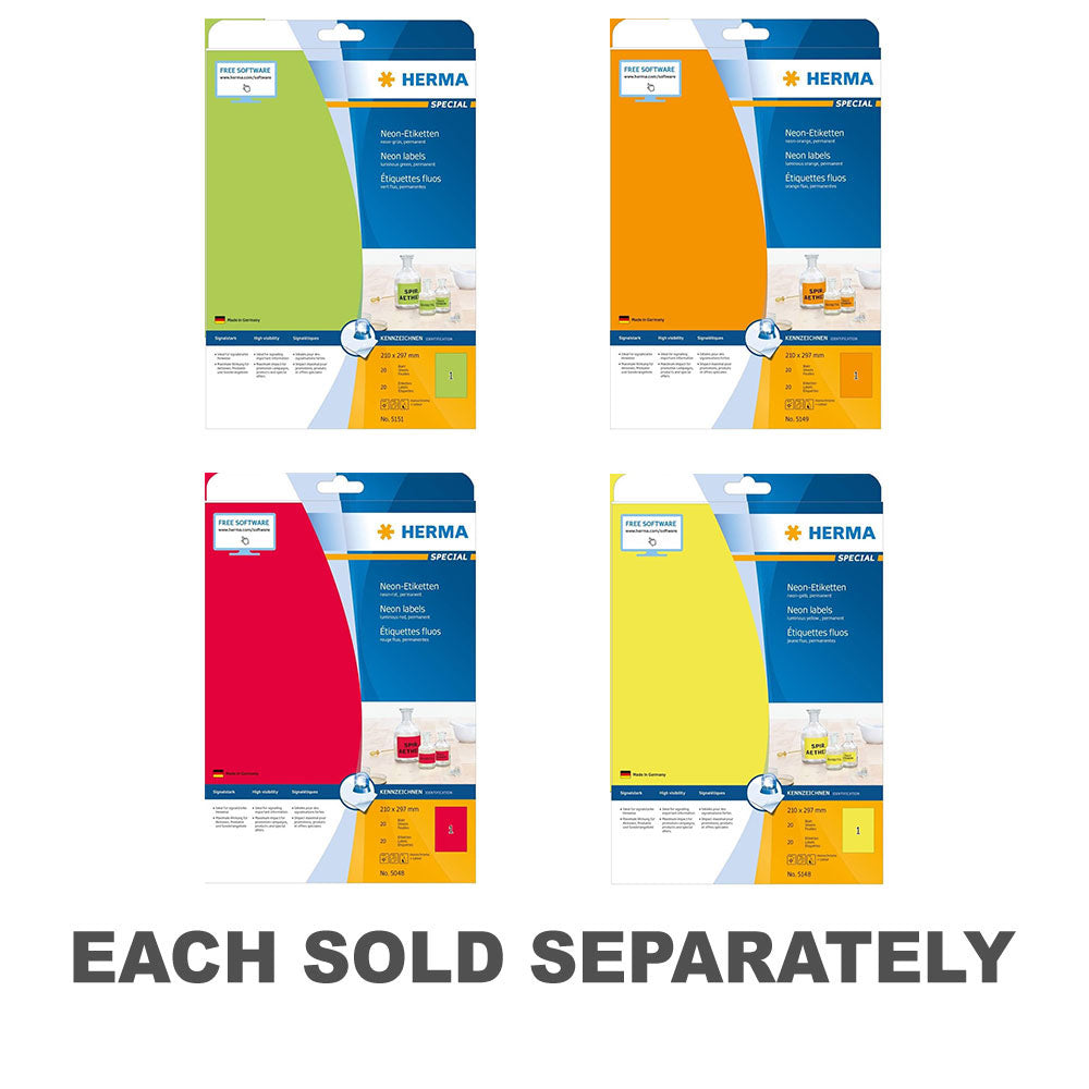 Illuminate your labeling tasks with Herma Luminous Neon Labels! This pack includes 20 A4-sized labels in vibrant neon colors, each measuring 210x297mm, offering high visibility and impact. With a luminous finish, these labels stand out in low-light conditions or crowded environments, making them perfect for attention-grabbing signage, event promotion, or creative projects. Whether for business presentations, party decorations, or arts and crafts, these luminous neon labels provide versatility and excitement for all your labeling needs. Get ready to shine bright with Herma Luminous Neon Labels!