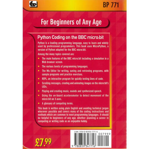 Python er et ledende programmeringsspråk, lett å lære og mye brukt av profesjonelle programmerere. Denne boken bruker Micropython, en versjon av Python tilpasset BBC Micro: Bit. Denne boken er skrevet på vanlig engelsk og unngår teknisk sjargong der det er mulig for å dekke kodingsinstruksjoner som er felles for de fleste programmeringsspråk. Passer for alle aldre eller erfaringsnivåer.