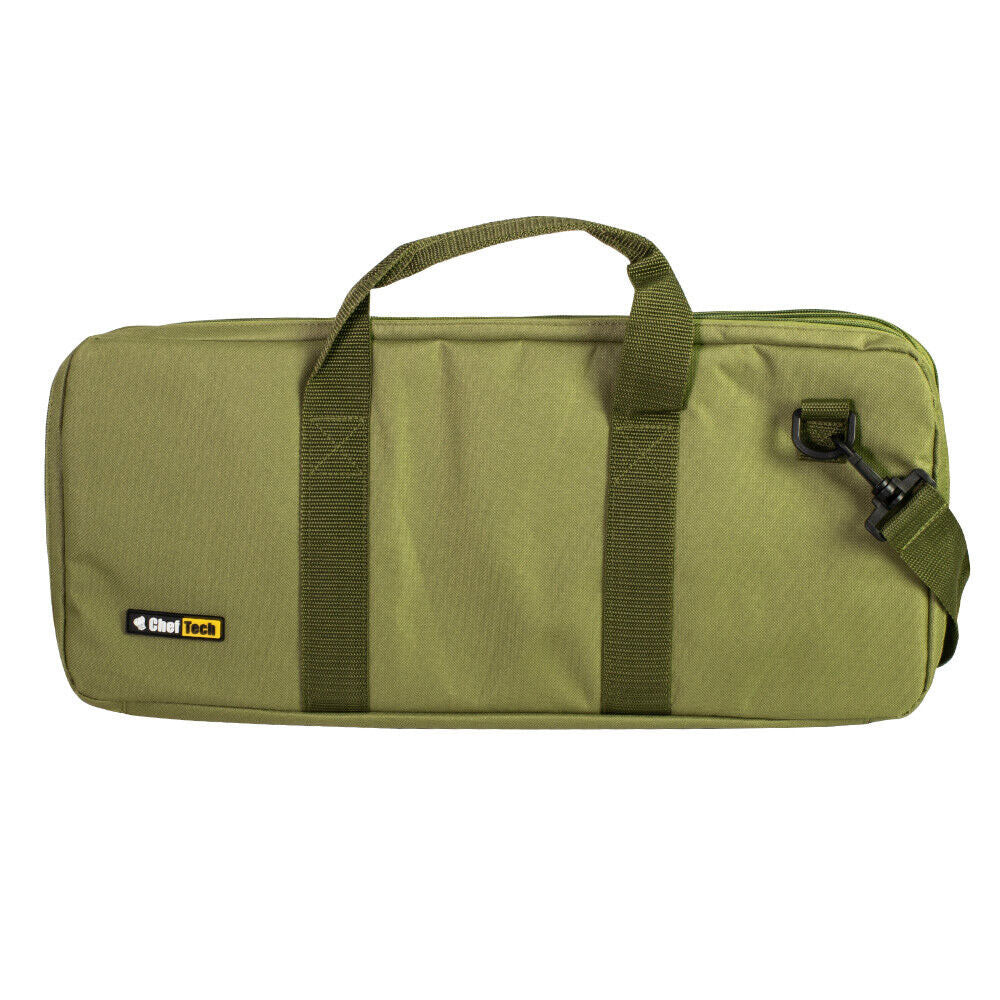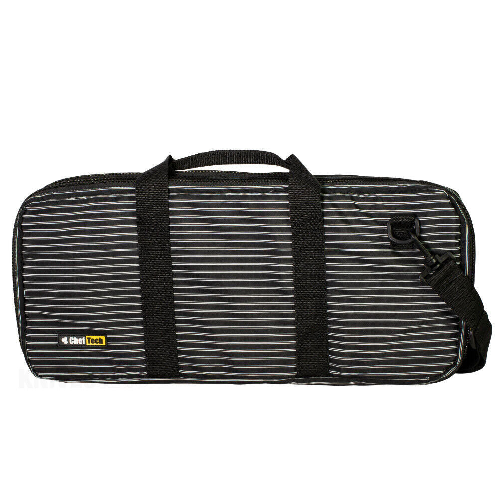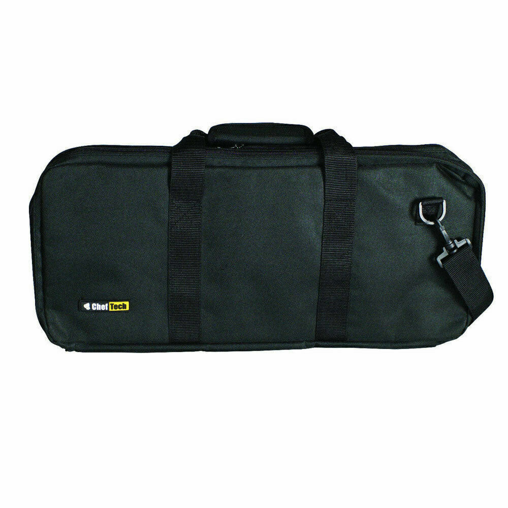 Cheftech noża torba zawiera 18 kieszeni i jest wytwarzana z wyściełanego materiału 600 denier i oferuje 3 osobne wentylowane przedziały dla noży i akcesoriów. Torba toczy się wygodnie w celu łatwego transportu z uchwytami, paskiem na ramię i magazynem I.D.