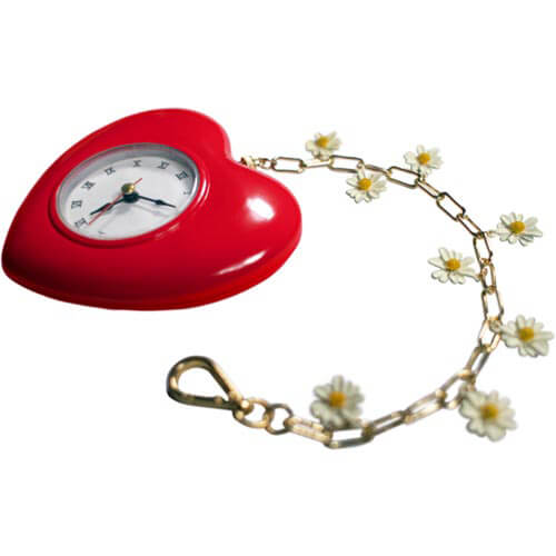 Ten zegar w kształcie serca o wymiarach 11 cm jest wykonany z metalu i ma działający zegarek kwarcowy w środku, tworząc niezbędny kleszcza prawdziwego serca. Do serca przymocowana jest złoty łańcuch, który jest ozdobiony stokrotkami i ma zamknięcie klipu homara.
