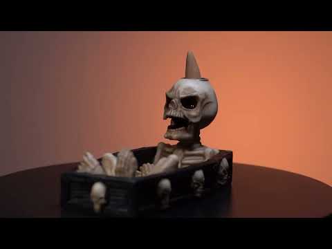 Tajemniczy kadzidło w kształcie szkieletu siedzącego w trumnie. Umieść oświetlony stożek na szkielecie, aby zobaczyć dym przepływający przez jego usta. Odpowiednie zarówno do patyków kadzidełkowych lub szyszek.