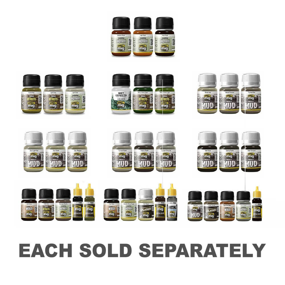 The pigments set you need to give your kits the rusty look you want. It includes three tones; an orange pigment for fresh and recent rust (A.MIG LIGHT RUST-3006), a darker tone for older rust (A.MIG TRACK RUST-3008) and a medium toned rust color. (A.MIG -3005 MEDIUM RUST)
