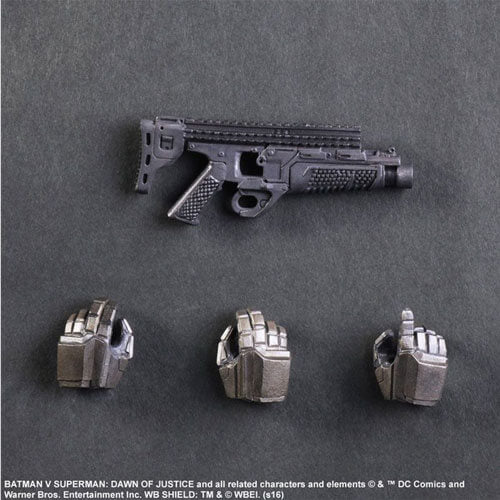 The hulking and heroic appearance of Batman's suit has been recreated by Square Enix as a Play Arts Kai series action figure. They have carefully contrasted the hard metallic edges of the suit with flowing organic details of cloth-like texturing on the cape. Tiny nicks, scratches and weathering detail on the armor show Batman"s battle scars while his eyes, painted with a pearlescent paint, look almost as if they are glowing.