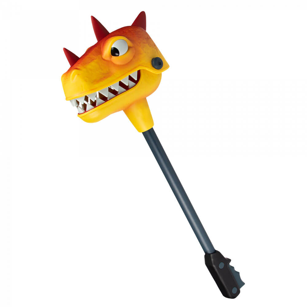 Designed directly from in-game assets of the epic skin for the pickaxe (aka harvesting tool), the Bitemark life-size replica has been carefully sculpted and painted for an authentic look, and is approximately 38" tall. The Bitemark Harvesting Tool features a savagely fierce Dinosaur head on a stick, resembling the classic snapper toys, and comes showcased in premium glossy Fortnite themed packaging.