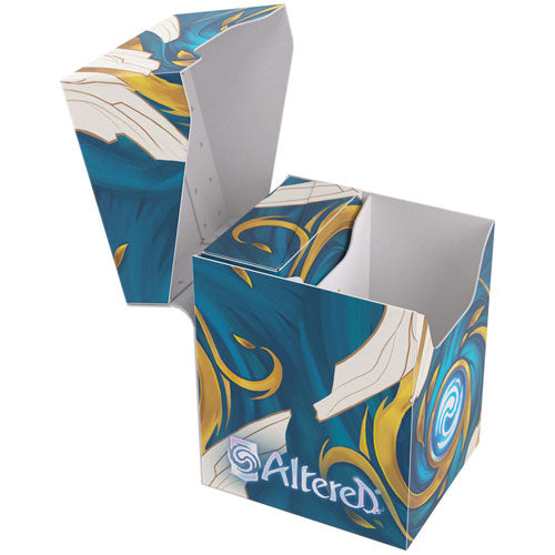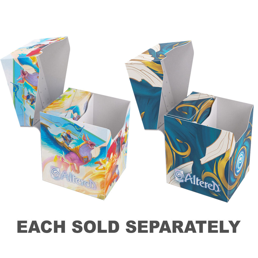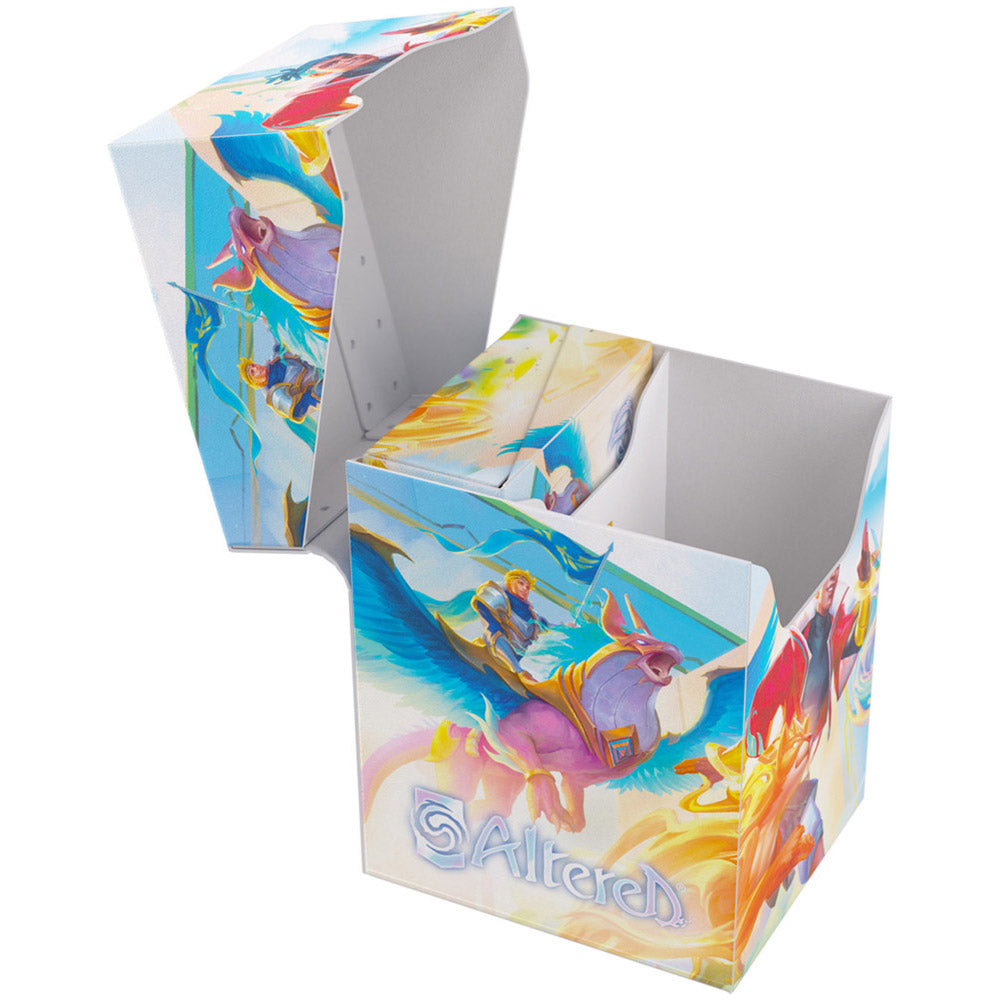 The Altered Expedition Soft Box is the all-in-one casual solution for players of the highly awaited TCG. This full color printed and officially licensed deck box is packed with ingenious features. It protects a full double-sleeved deck of cards and includes an innovative token box! This token box has a smart click-lock mechanism to keep all tokens safely stored - even while pulling it out. Once opened, the lid of the box stays upright for convenient access during gameplay. The Expedition Soft Box is equipped with Gamegenic's very own Cobra Neck-Technology: the lid can be opened more than 180-degree for easy access. Additionally, it comes with a self-locking lid and write-on-strip. The separator inside ensures that the deck stays in place, even when the token box is taken out. The Altered Expedition Soft Box comes in two amazing designs from the game and is a must-have for all Altered, TCG, and LCG players